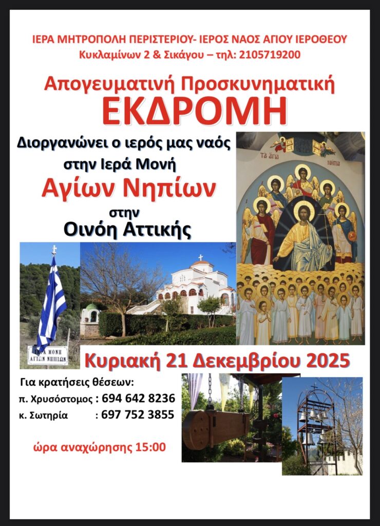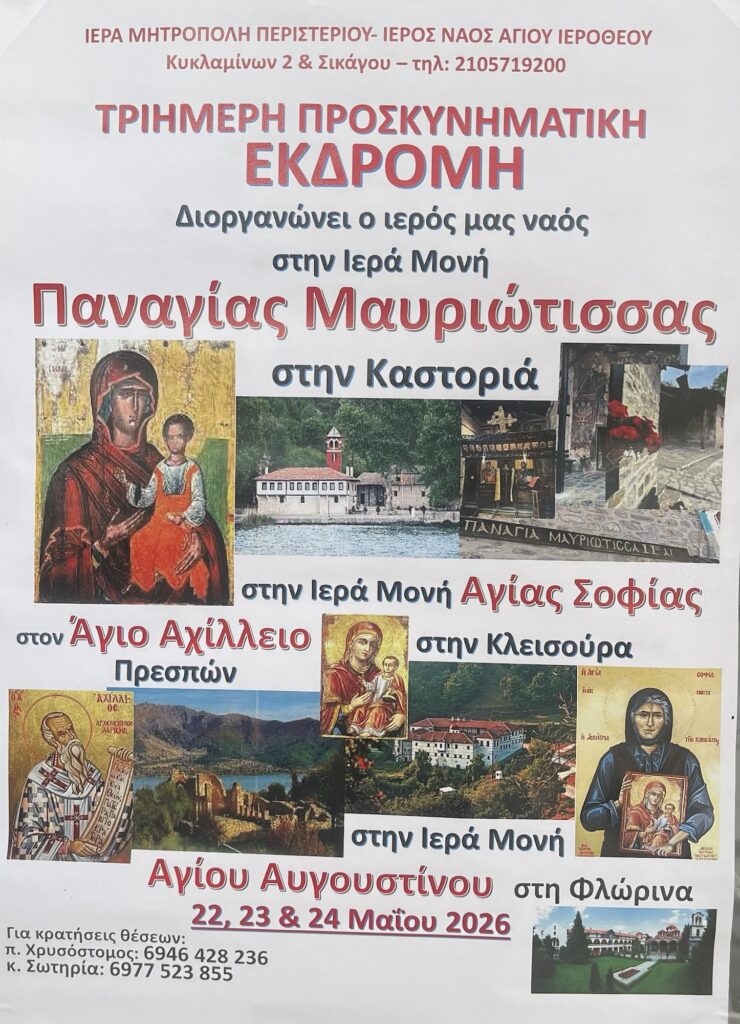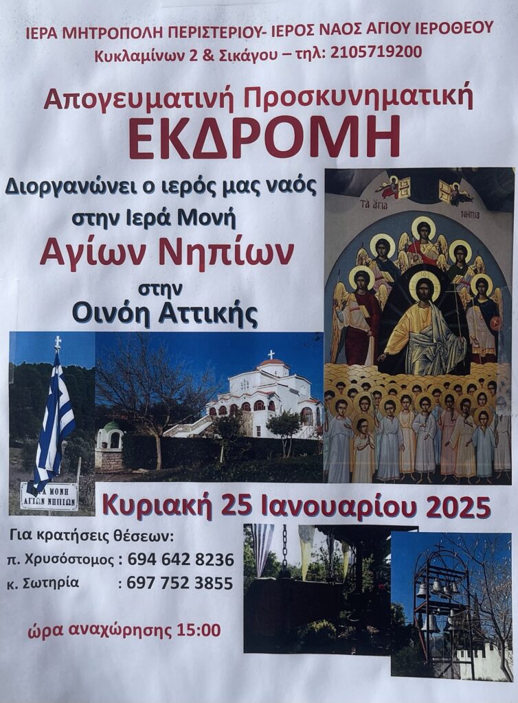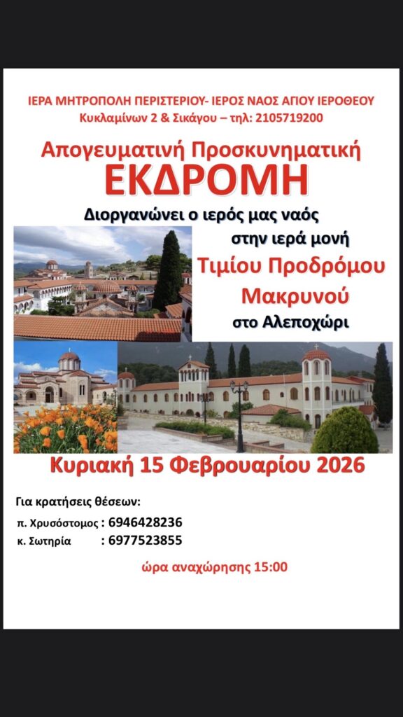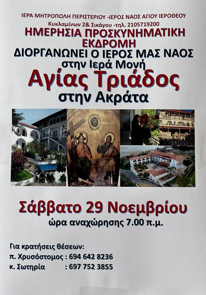 Ο Ιερός μας Ναός διοργανώνει προσκυνηματικές εκδρομές σε ποικίλες Μονές ανά την Ελλάδα, προς πνευματική ωφέλεια των ευλαβών πιστών.