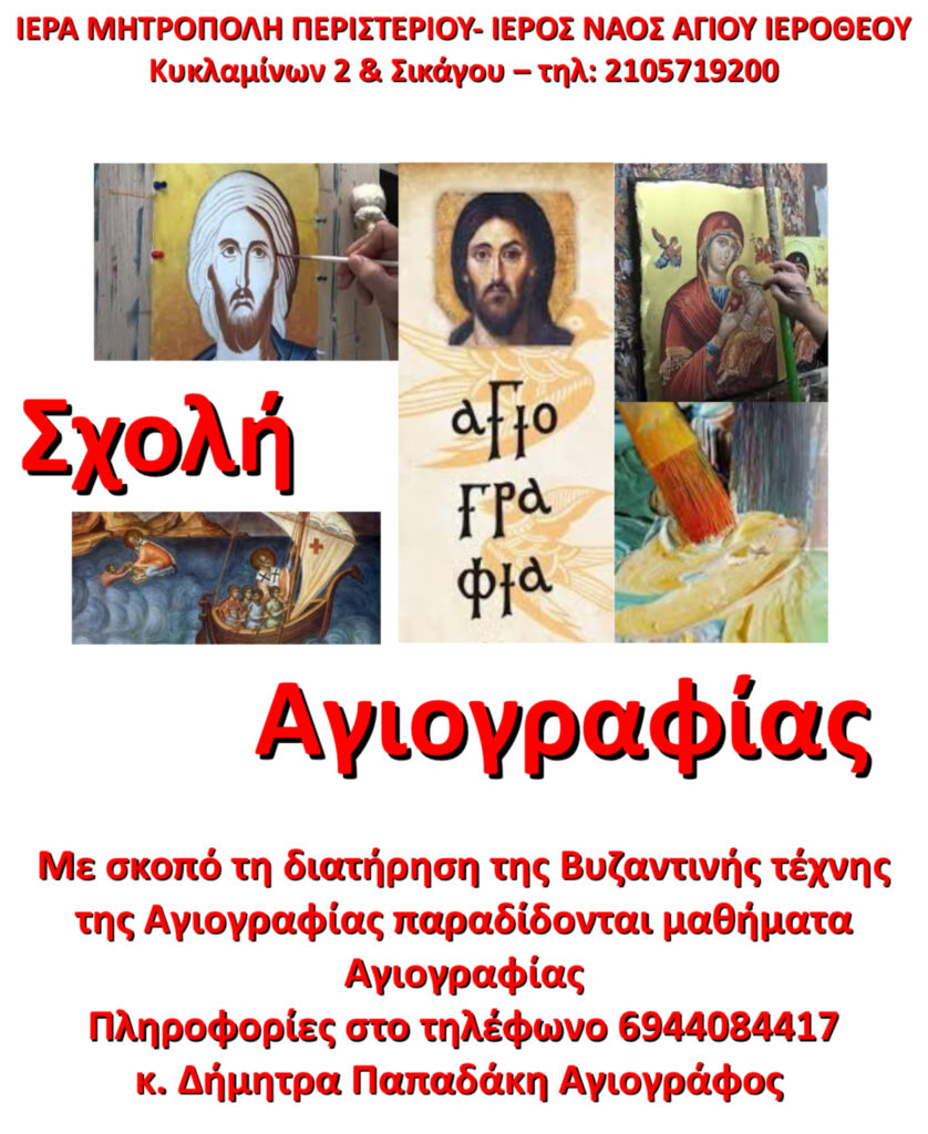 Με σκοπό τη διατήρηση της Βυζαντινής τέχνης της Αγιογραφίας, στο Ναό παραδίδονται μαθήματα Αγιογραφίας ενηλίκων και ανηλίκων.