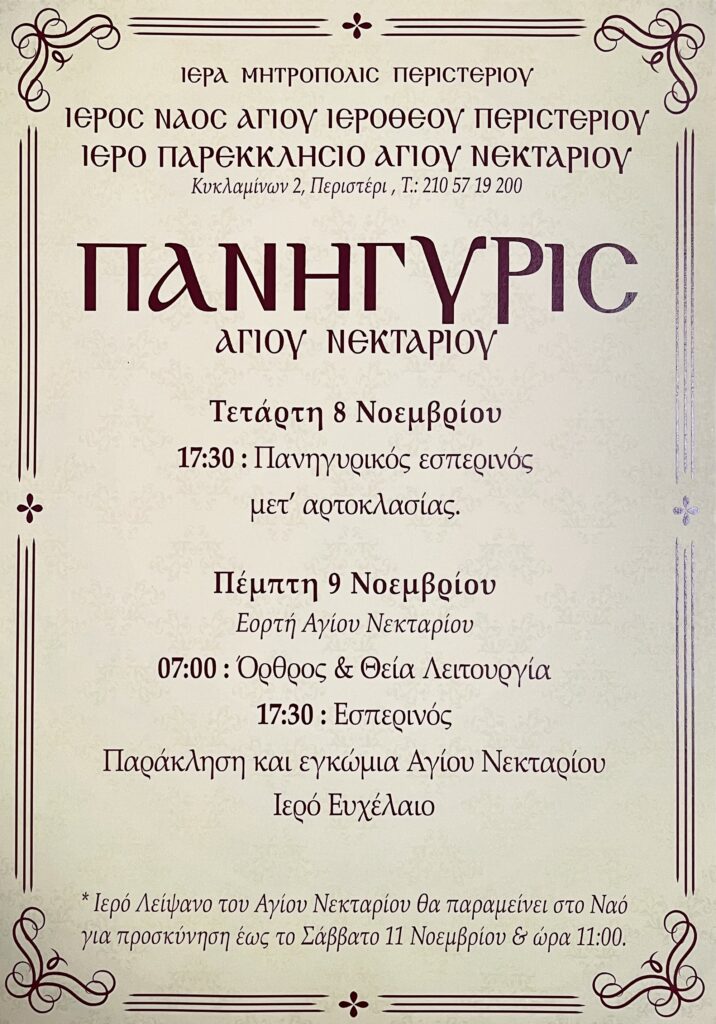 Πρόγραμμα Πανηγύρεως Αγ. Νεκταρίου